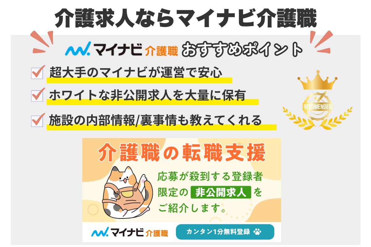 数ある介護職向けの転職サイトの中で、圧倒的におすすめなのが、非公開求人も内部情報も大量に保有している超大手マイナビが運営する「マイナビ介護職」です。