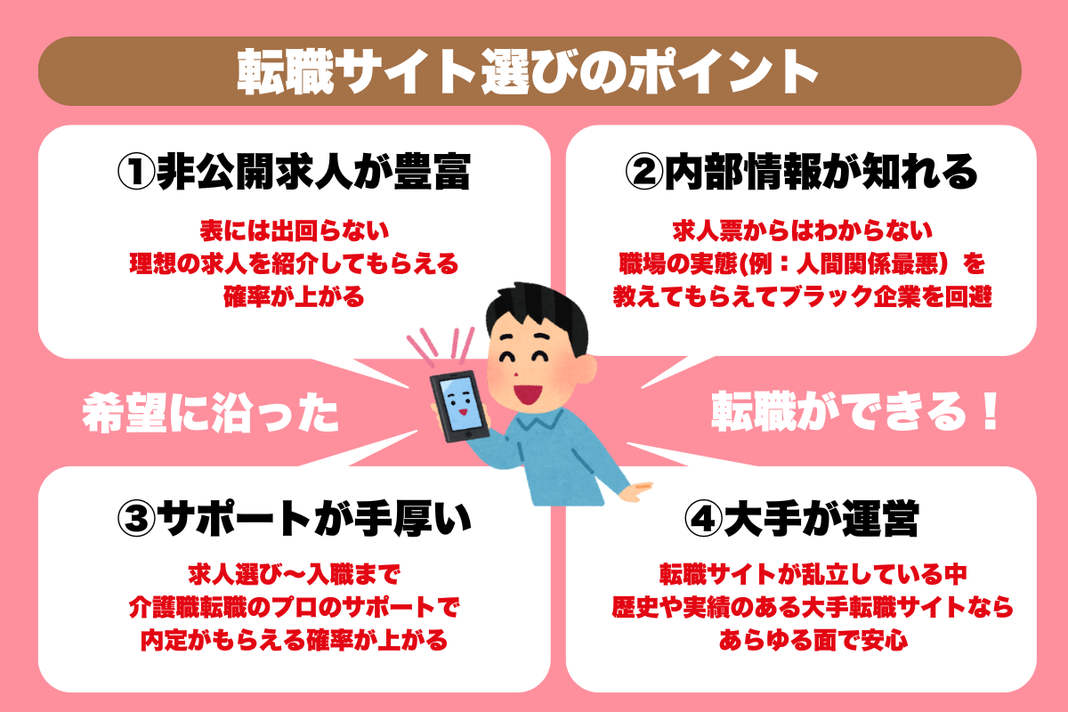登録すべきは以下の4つのポイントを満たした介護職専門の転職サイトです。