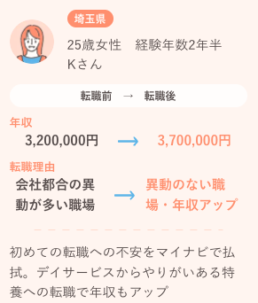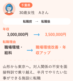 マイナビ介護職が保有する「大量の非公開求人」と「職場の内部情報や実態情報」を活用して、ホワイトな職場へ転職している方が多数いる実績のあるサービスです。(以下はマイナビ介護職で転職に成功した方の事例です)